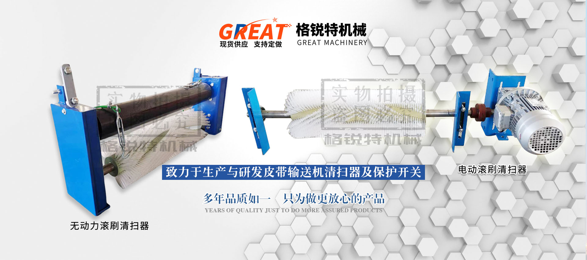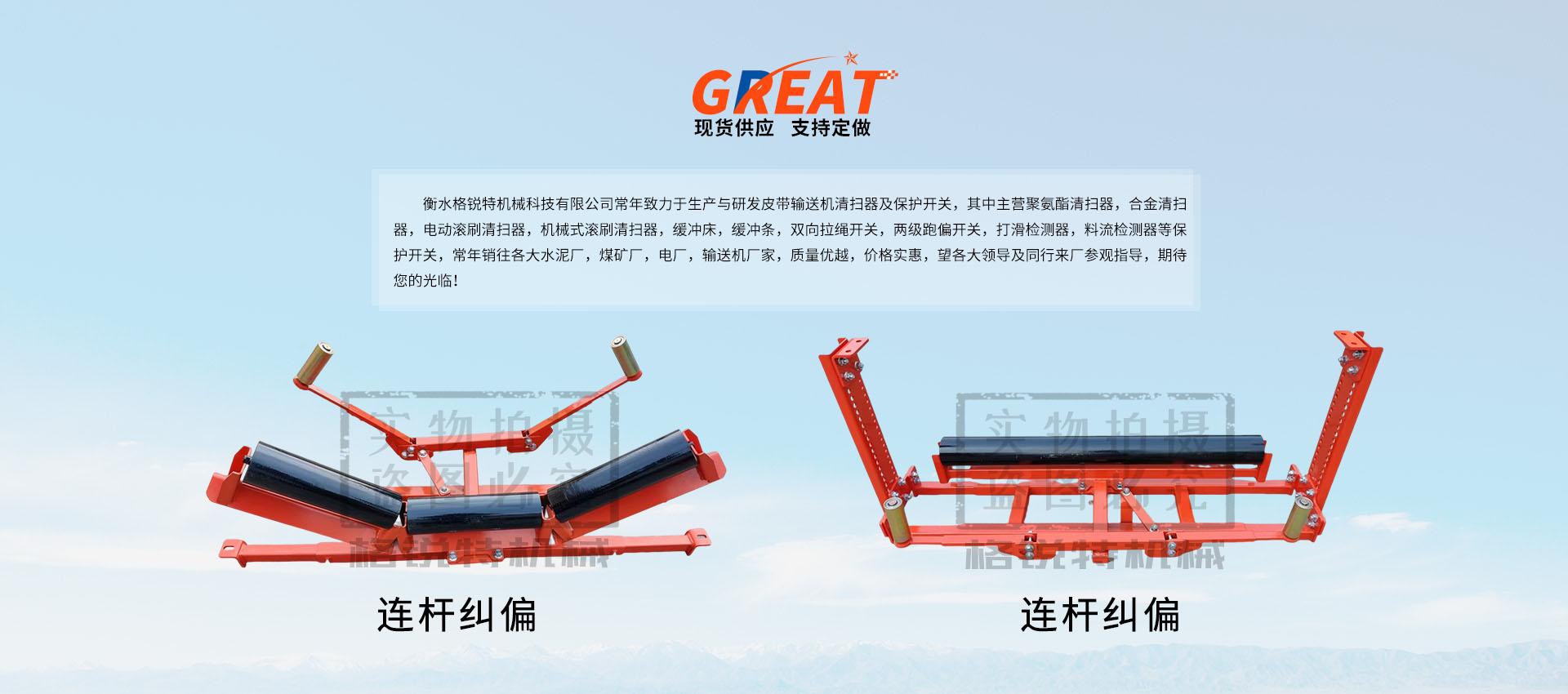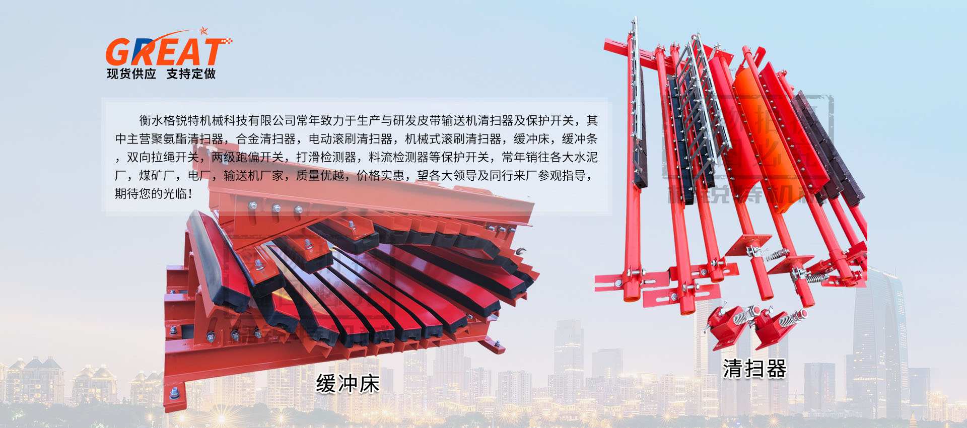 衡水格銳特機(jī)械科技有限公司常年致力于生產(chǎn)與研發(fā)皮帶輸送機(jī)清掃器及保護(hù)開關(guān),其中主營聚氨酯清掃器,合金清掃器,電動(dòng)滾刷清掃器,機(jī)械式滾刷清掃器,緩沖床,緩沖條,雙向拉繩開關(guān),兩級跑偏開關(guān),打滑檢測器,料流檢測器等保護(hù)開關(guān),常年銷往各大水泥廠,煤礦廠,電廠,輸送機(jī)廠家,質(zhì)量優(yōu)越,價(jià)格實(shí)惠,望各大領(lǐng)導(dǎo)及同行來廠參觀指導(dǎo),期待您的光臨?。?!